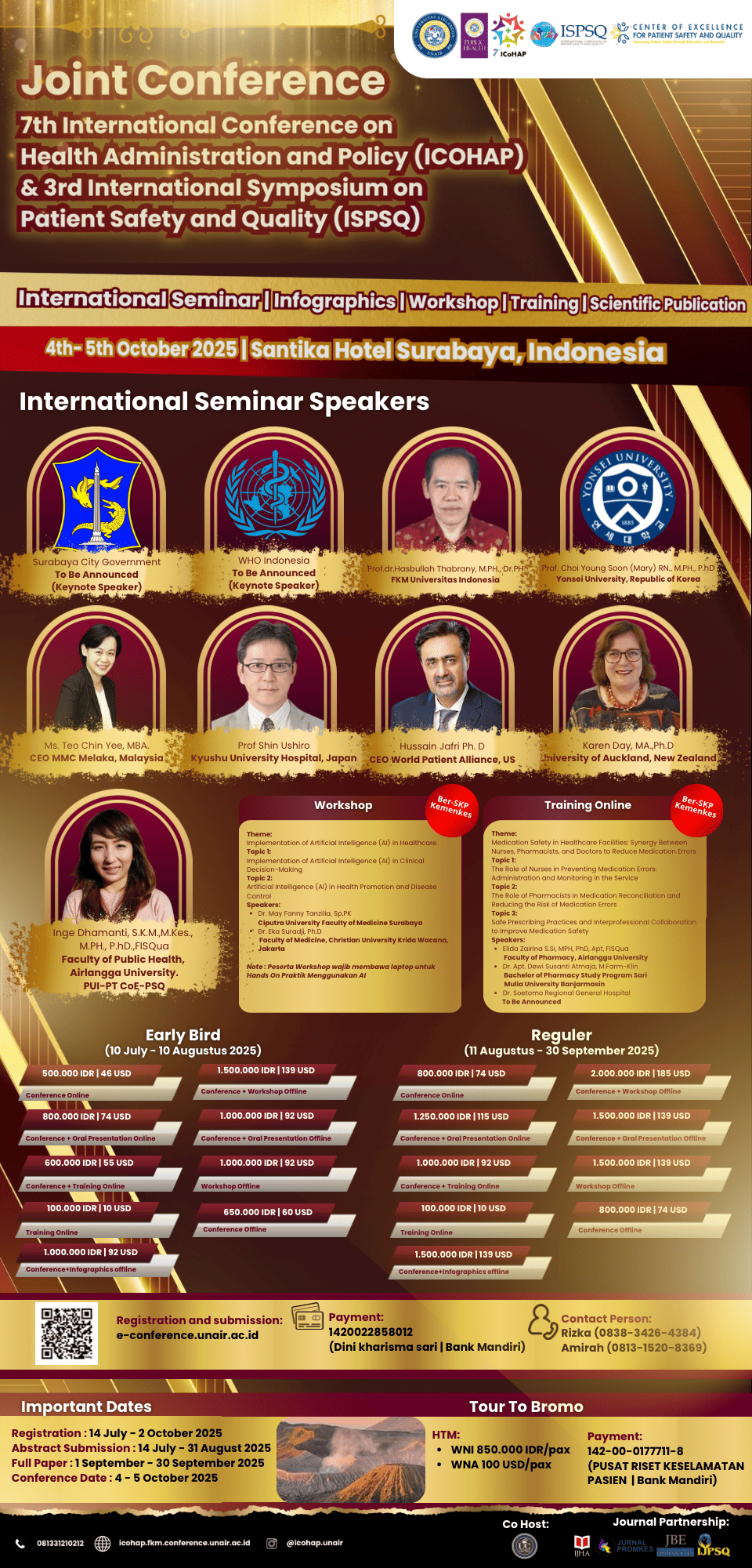 The Joint Conference: 7th International Conference on Health Administration and Policy (ICOHAP) & 3rd International Symposium on Patient Safety and Quality (ISPSQ) will be held in Santika Premiere Hotel, Gubeng, Surabaya City, East Java, Indonesia from October 4–5, 2025.