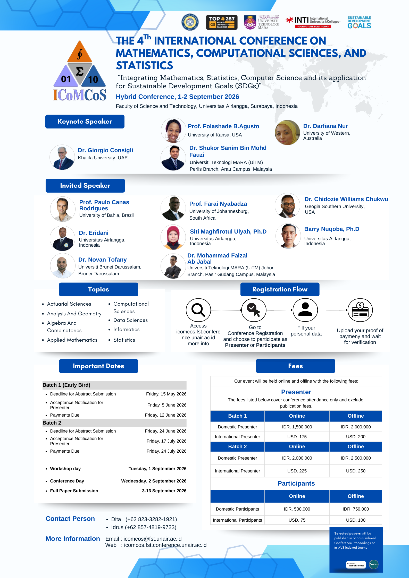 The 4th International Conference on Mathematics, Computational Sciences, and Statistics (ICoMCoS) is a biennial event hosted by the Mathematics Department, Faculty of Science and Technology, Universitas Airlangga. The events have been successfully held in 2020, 2022, and 2024. The Mathematics Department oversees 4 study programs: undergraduate and graduate programs in Mathematics, an undergraduate program in Information Systems, and an undergraduate program in Statistics. The conference theme emphasizes interdisciplinary collaboration among the study programs within the Mathematics Department through the theme “Integrating Mathematics, Statistics, Computer Science and its application for Sustainable Development Goals (SDGs)”.