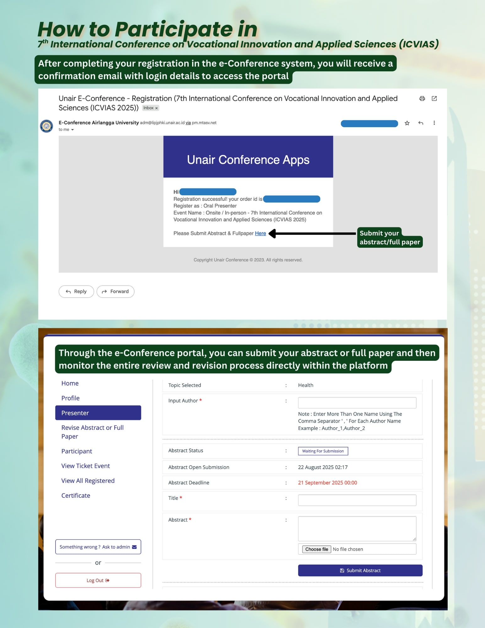After registering, you will receive a confirmation email with login details to access the e-Conference portal.