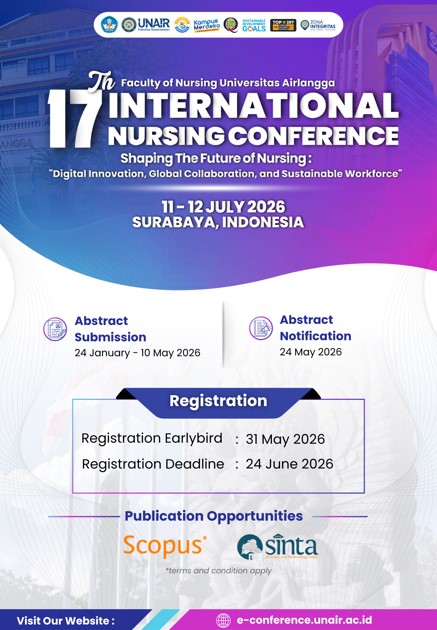 The 17th International Nursing Conference is organized by the Faculty of Nursing Universitas Airlangga as an international academic forum for academics, researchers, practitioners, and students in the field of nursing.